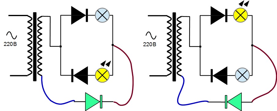 Схема подключается к трансформатору, на выходе переменное напряжение, например 12 Вольт. Измерительные провода подключаем по этой схеме. Если их замкнуть, то обе лапочки горят. Одна горит в положительные полуволны, через верхний диод, а вторая в отрицательные полуволны через нижний диод. Если измерительные провода разомкнуть, то обе лампочки погаснут.