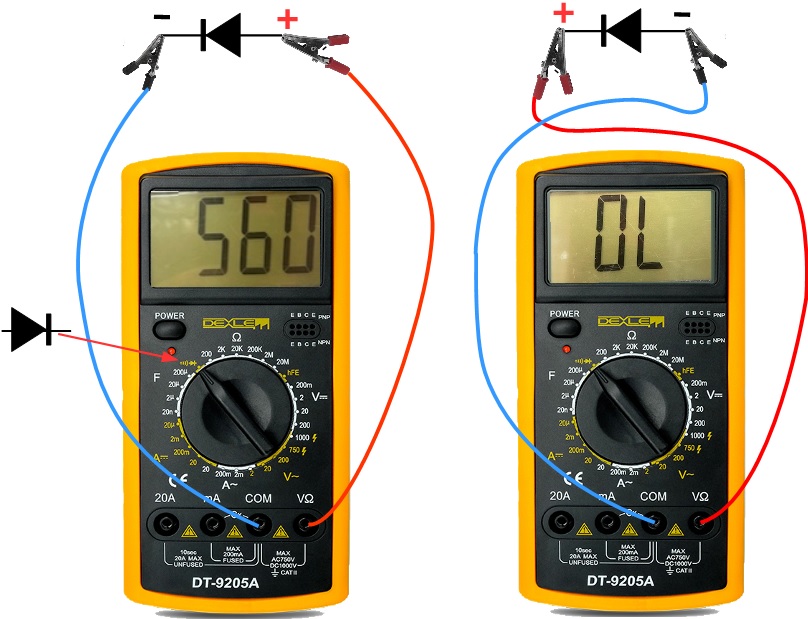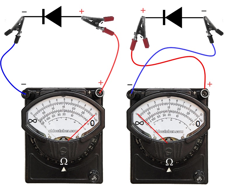 В стрелочном тестере всегда есть режим измерения сопротивления (омметр). Для проверки диода нам не важно какое сопротивление показывает омметр, важно только большое оно или маленькое, поэтому, нам важно куда отклоняется стрелка, в соторну нуля, или в строну бесконечности. Как вообще проверяется диод см. в предыдущей статье.