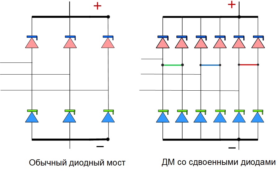 В диодном мосте № 1127319721 на месте каждого диода стоит два диода, они включены параллельно. Каждый диод рассчитан максимальный ток 50А, поэтому пара в составе диодного моста надежно держит ток 150А