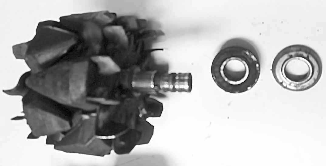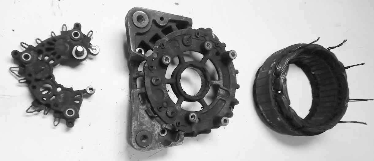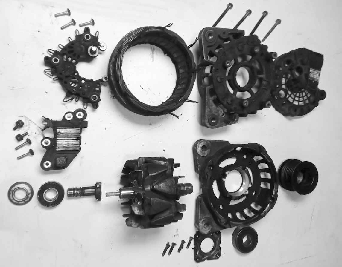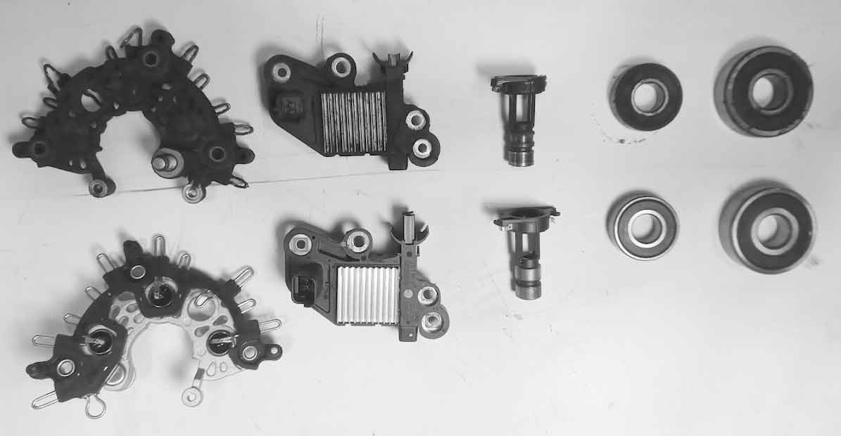 12. Старые и новые детали генератора: диодный мост, регулятор напряжения, кольца ротора, подшипники.